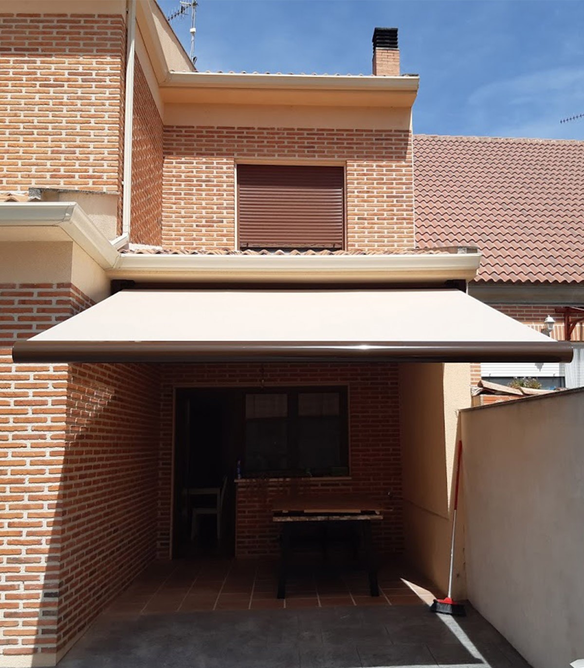 Toldo K-Set 25 con cofre de aluminio y con brazos extensibles . Quedando recogido tanto la lona como los brazos dentro del toldo para una mayor protección de estos elementos. Toldo recomendado para su instalación en terrazas.